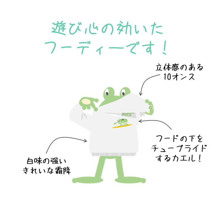 プリントデザイン|チューブライドでフードの下をくぐるカエルが可愛い数量限定商品です。前はシンプル、後ろは楽しいギミックが効いている。そんなフーディ―をお探しの方はお早目に!